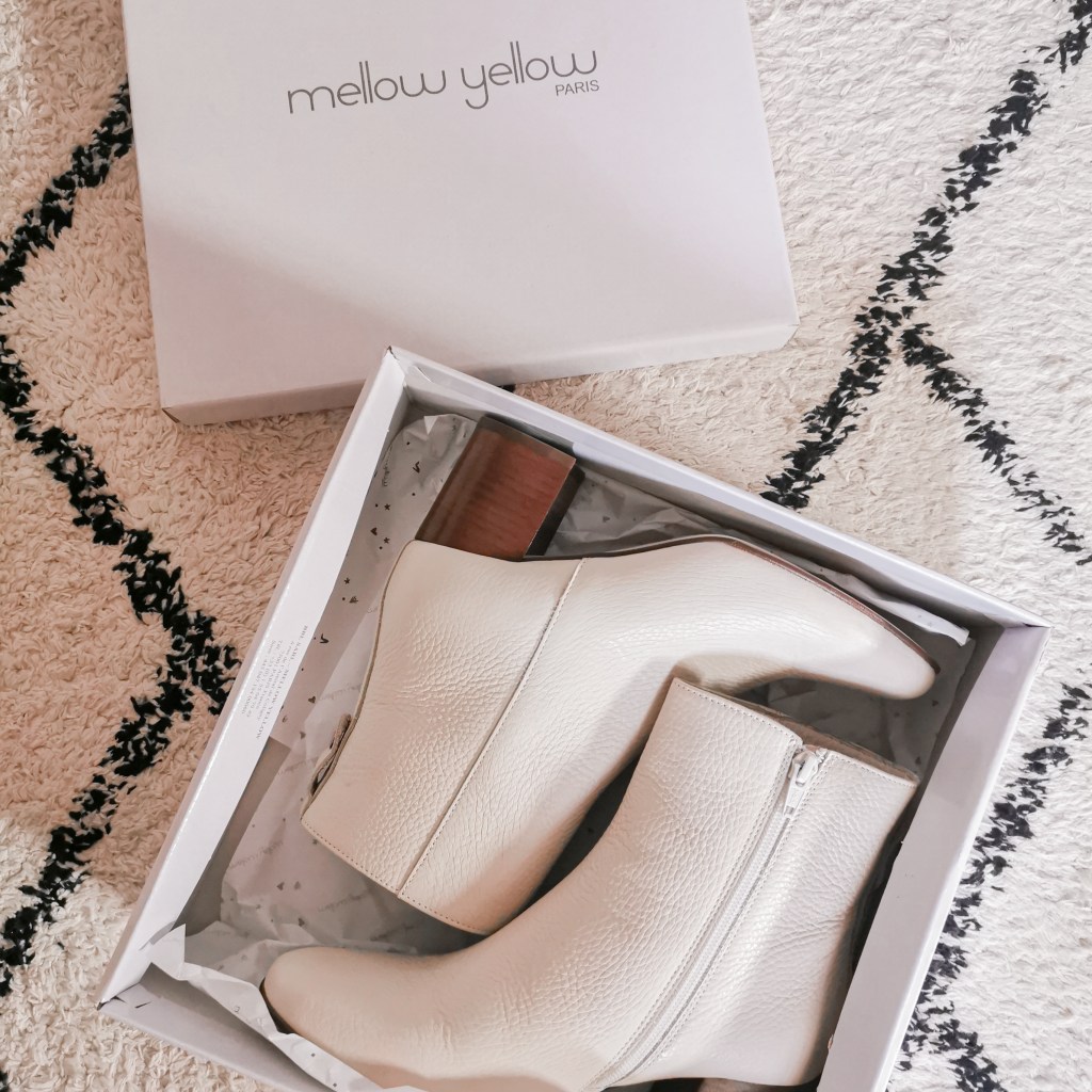 J’ai longtemps hésité avant de craquer pour elles, et puis l’évidence était telle qu’il me les fallait ! Après des mois à tergiverser, les soldes sont passés par là et m’ont permise de craquer pour ces bottines blanches (plutôt crème même je dirais) en cuir tendre et grainé de la marque Mellow Yellow Paris. Elles sont parfaites et je les portes à la moindre occasion. En plus d’être superbes, elles sont aussi très confortables (une caractéristique des chaussures Mellow Yellow qui ont certes leur prix mais la qualité suit). J’ai les pieds fragiles et facilement douloureux, avec celles-ci aucun soucis je peux traverser Paris à pieds sans problèmes (enfin, presque!).